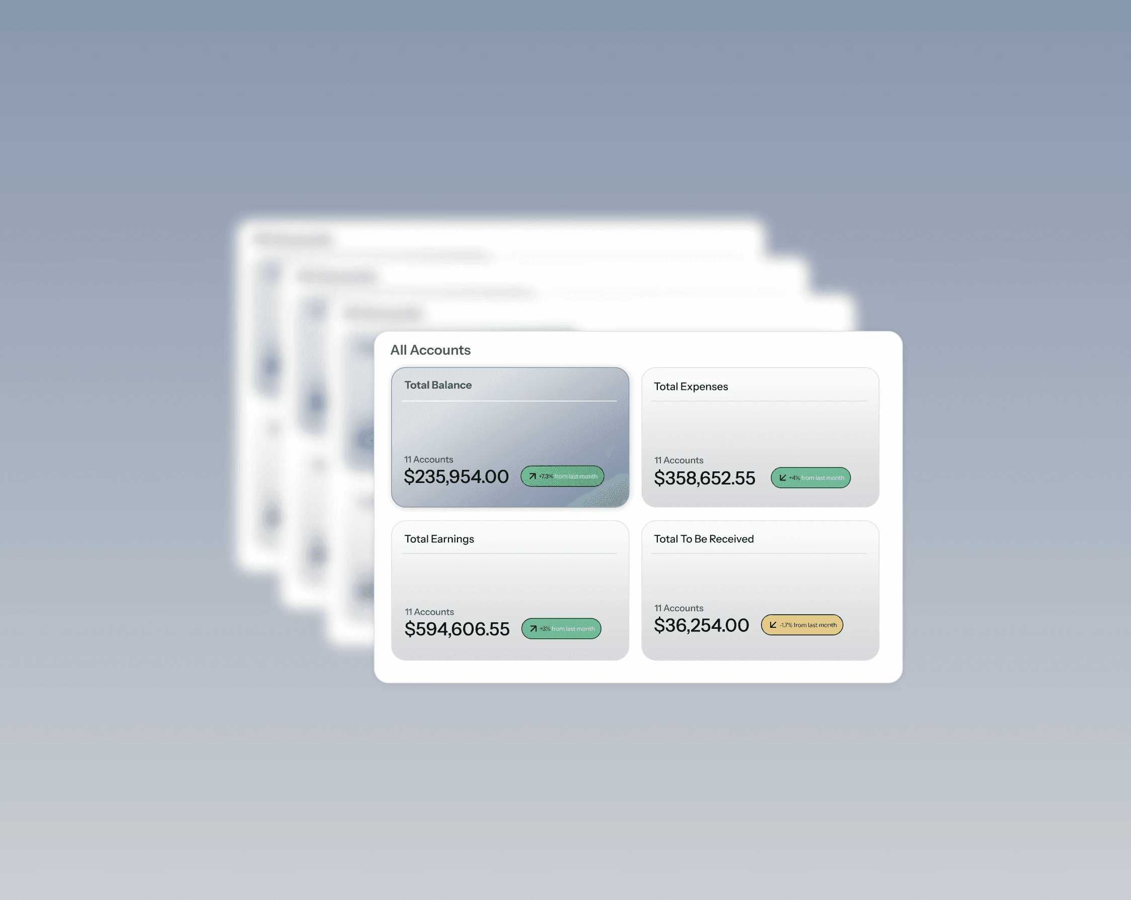 Resumo dos saldos de várias contas, indicando a quantidade total de contas e também um elemento para comparar a evolução de cada categoria com o mês anterior