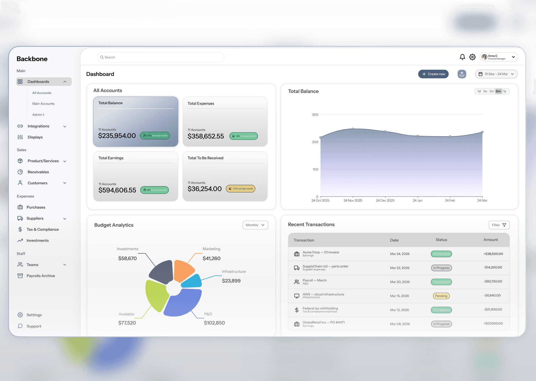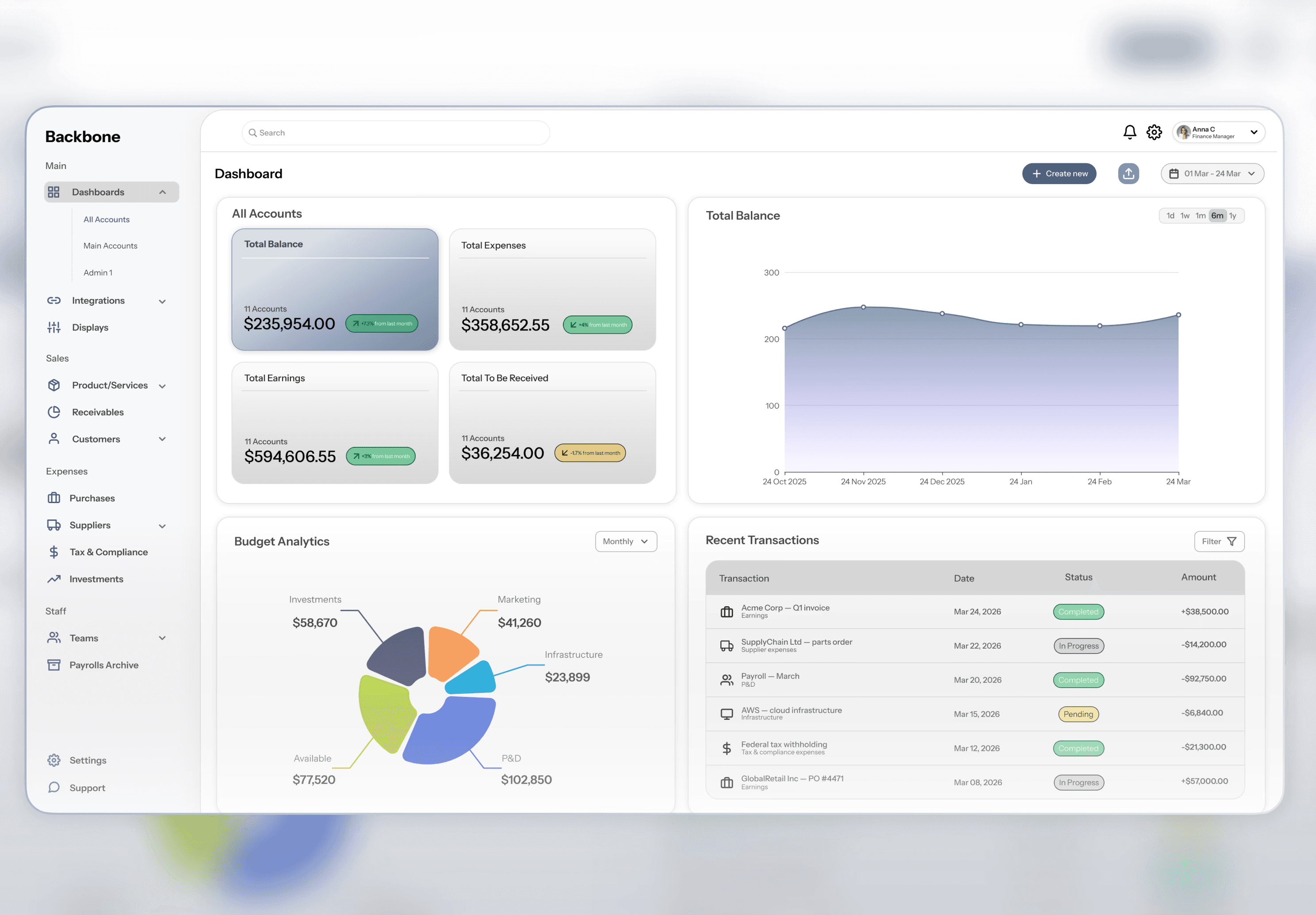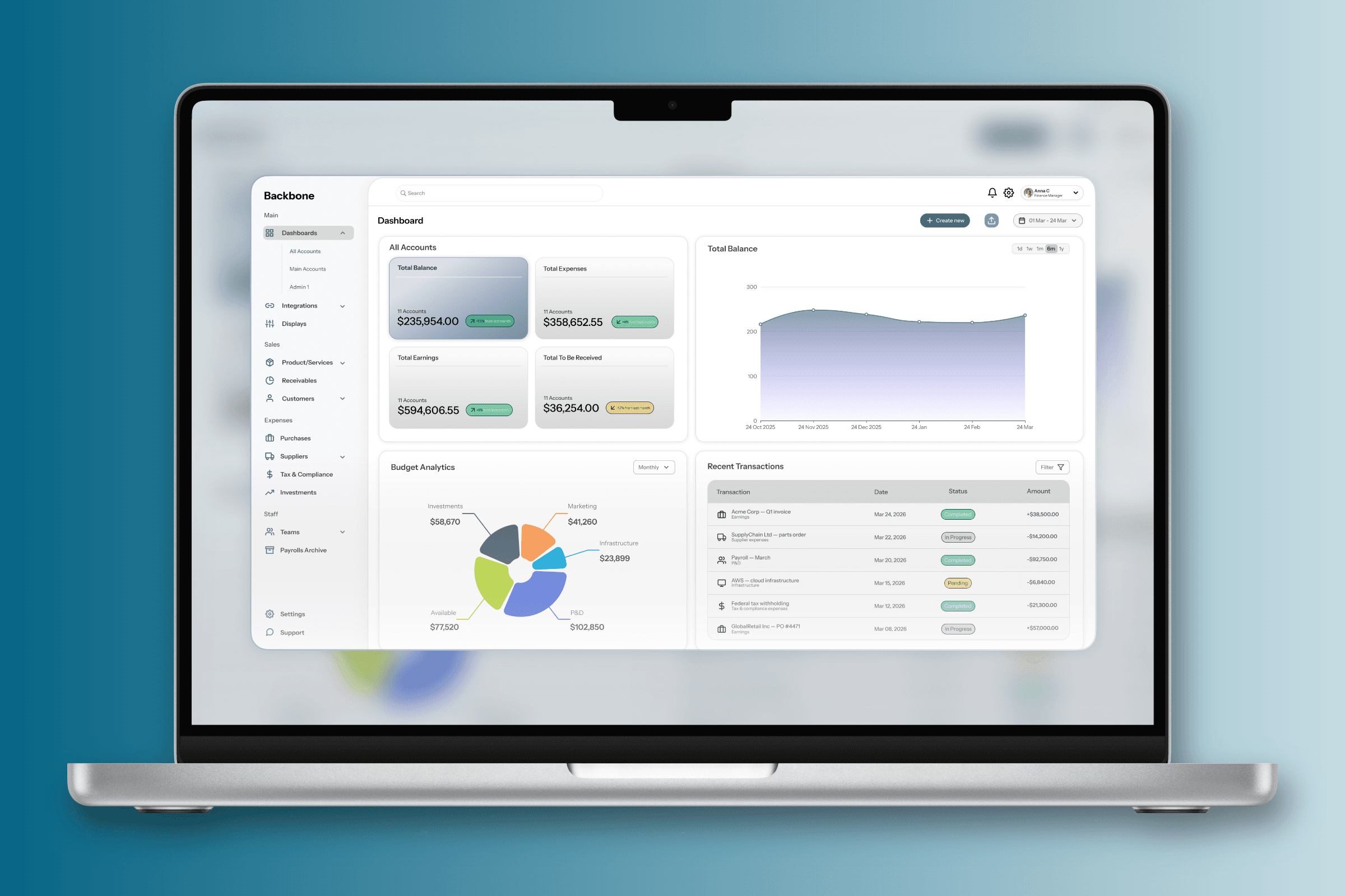 Este design foi desenvolvido a partir de um briefing previamente estabelecido, focado em apresentar a página inicial de um Dashboard de gestão financeira da empresa Backbone para usuários experientes e tradicionais, que passam bastante tempo no software.