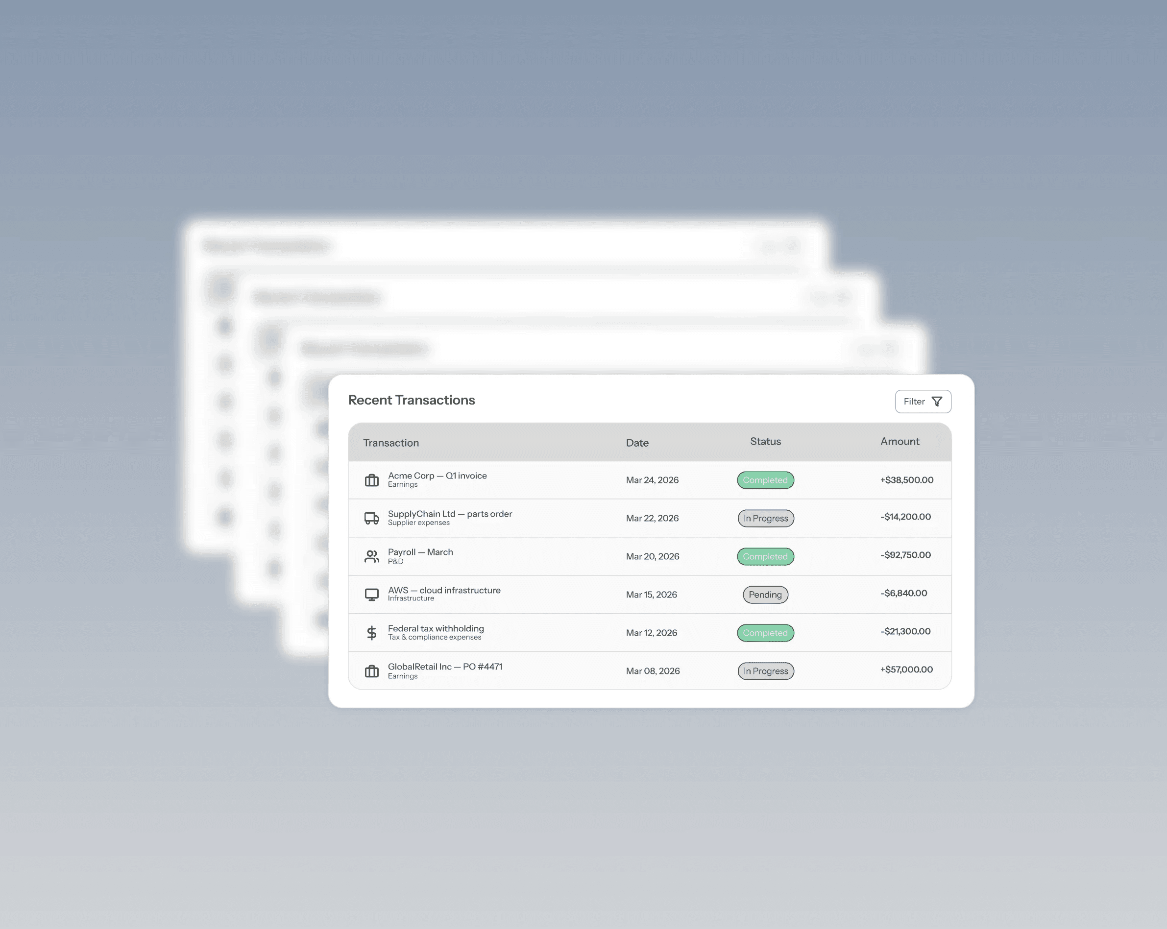 Lista de transações recentes com recursos de filtragem, contendo informações da categoria da transação, data, status com contexto visual e valor positivo ou negativo