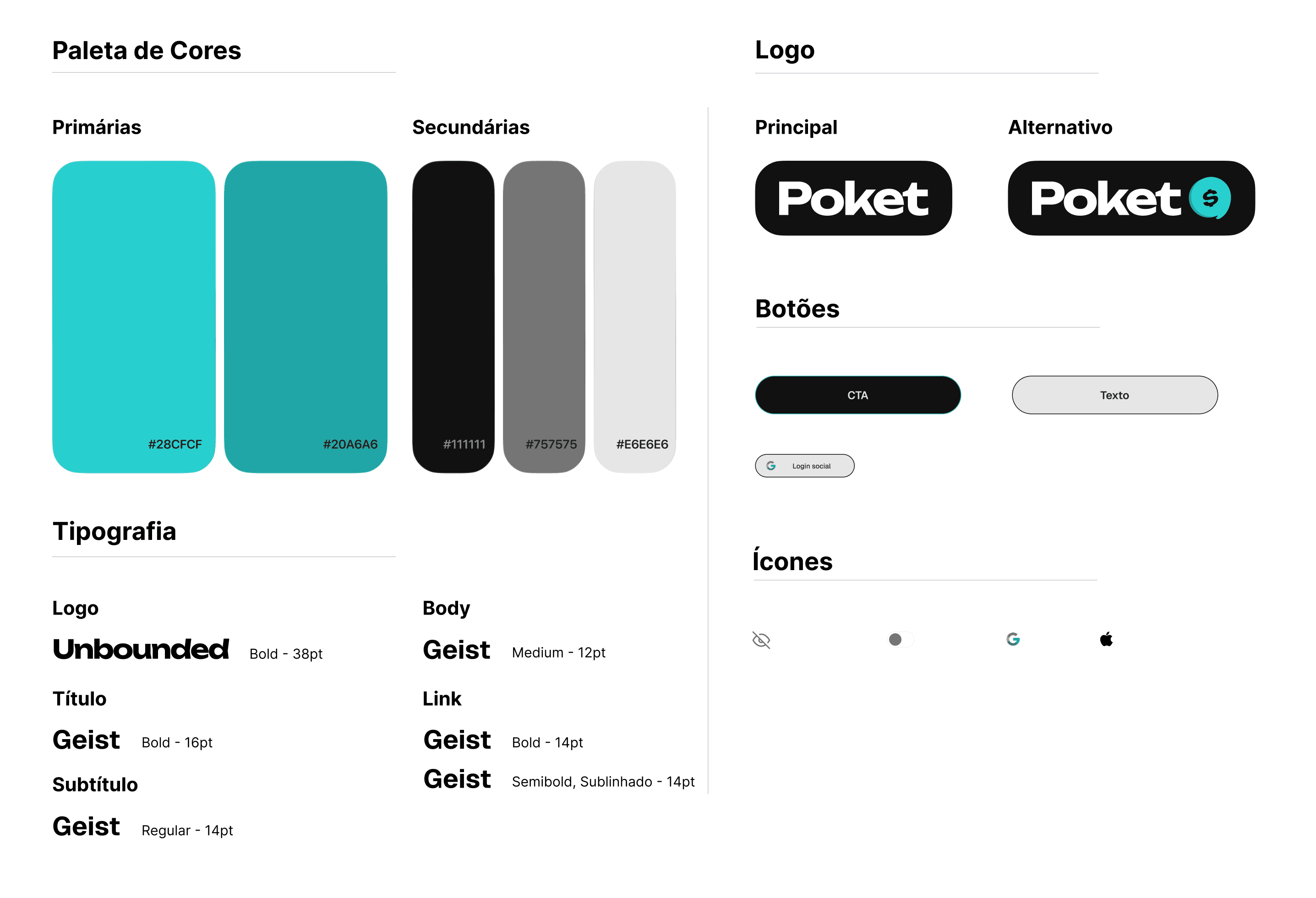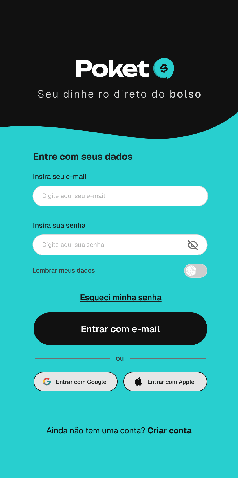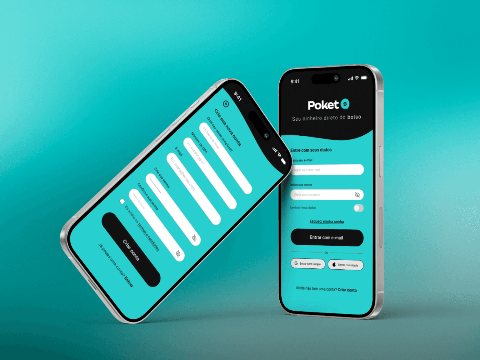 Páginas de signup, login e cadastro desenvolvidas no Figma como estudo para empresa fictícia Poket.
