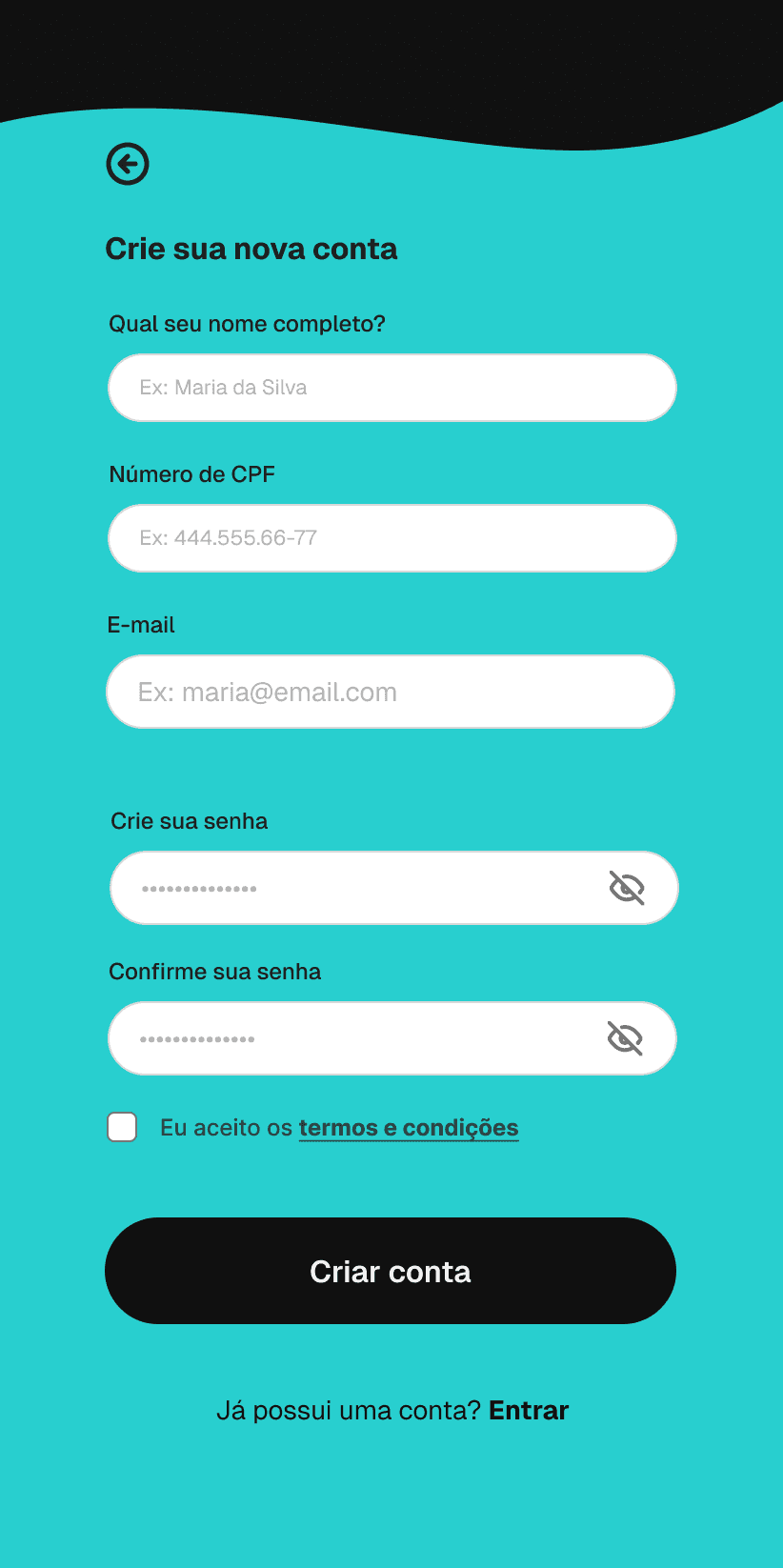 Para a primeira tela de signup, coloquei como prioridade a visão do logo, slogan e ícone para identificação rápida da marca. Adicionei formas dentro das cores principais, adicionando movimento e ponto de interesse na tela inicial.